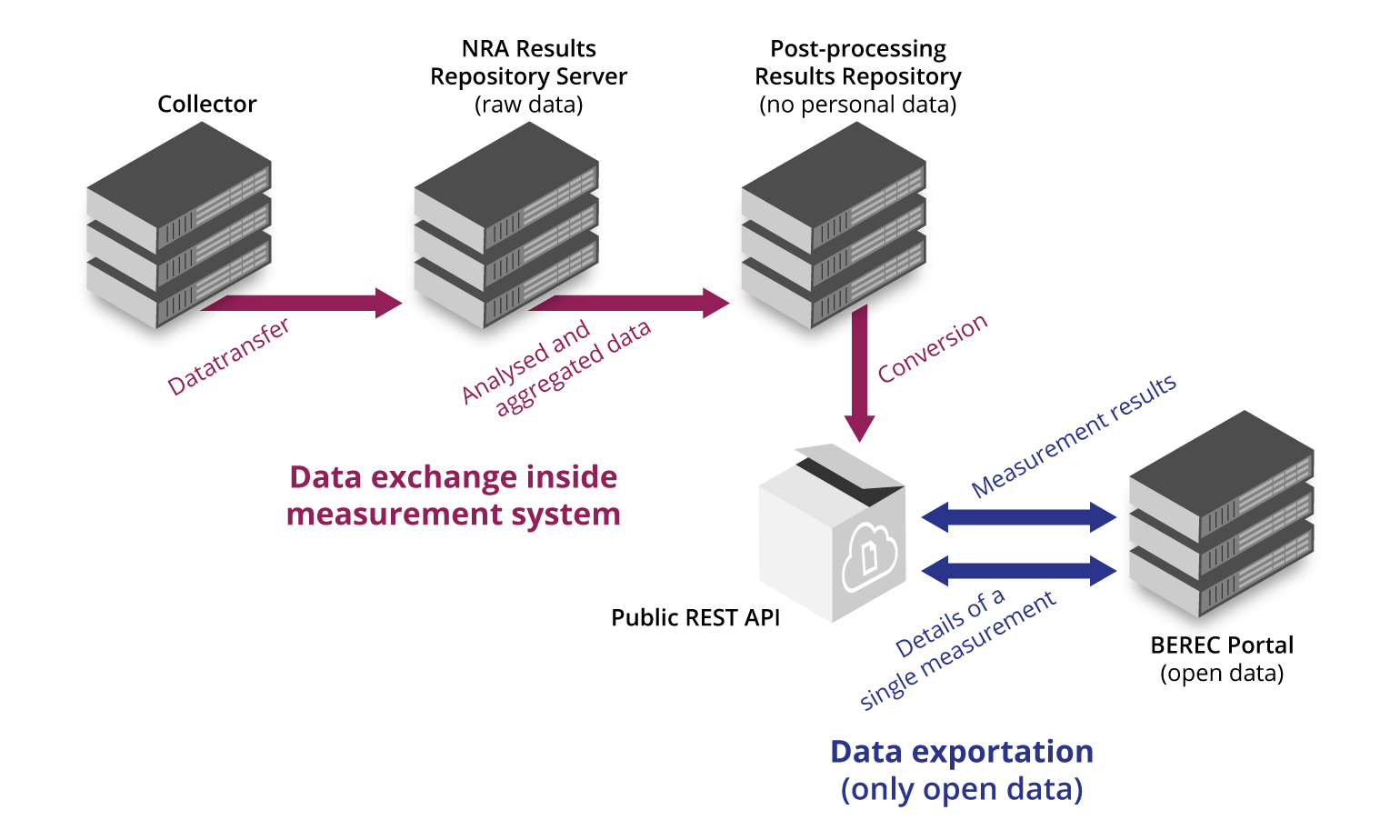 The measurement results shared between NRAs shall be Open Data. When results are made available via an Open Data interface, data can be collected for centralised post-processing of shared data (“Data exportation”), such as the BEREC