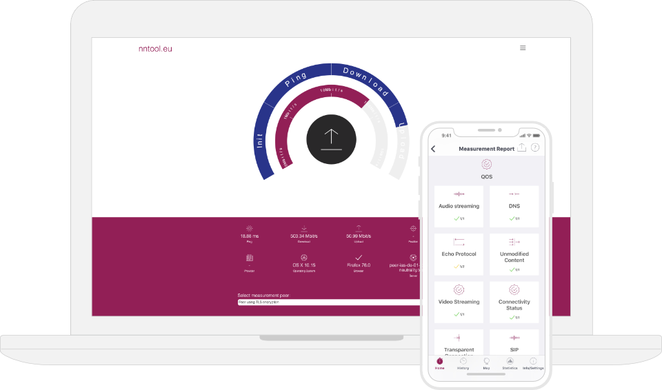 BEREC names download and upload speed, latency and packet loss. Additionally, the assessment of the reliability of such a single measurement shall refer to the existing measurement conditions. Individual parameters become more meaningful when they are linked to meta-information such as location, movement, end device of the person measuring. Further parameters such as blocked ports, modified content, internet routes, etc. prove to be indispensable for the implementation of traffic management monitoring from our experts’ point of view.
